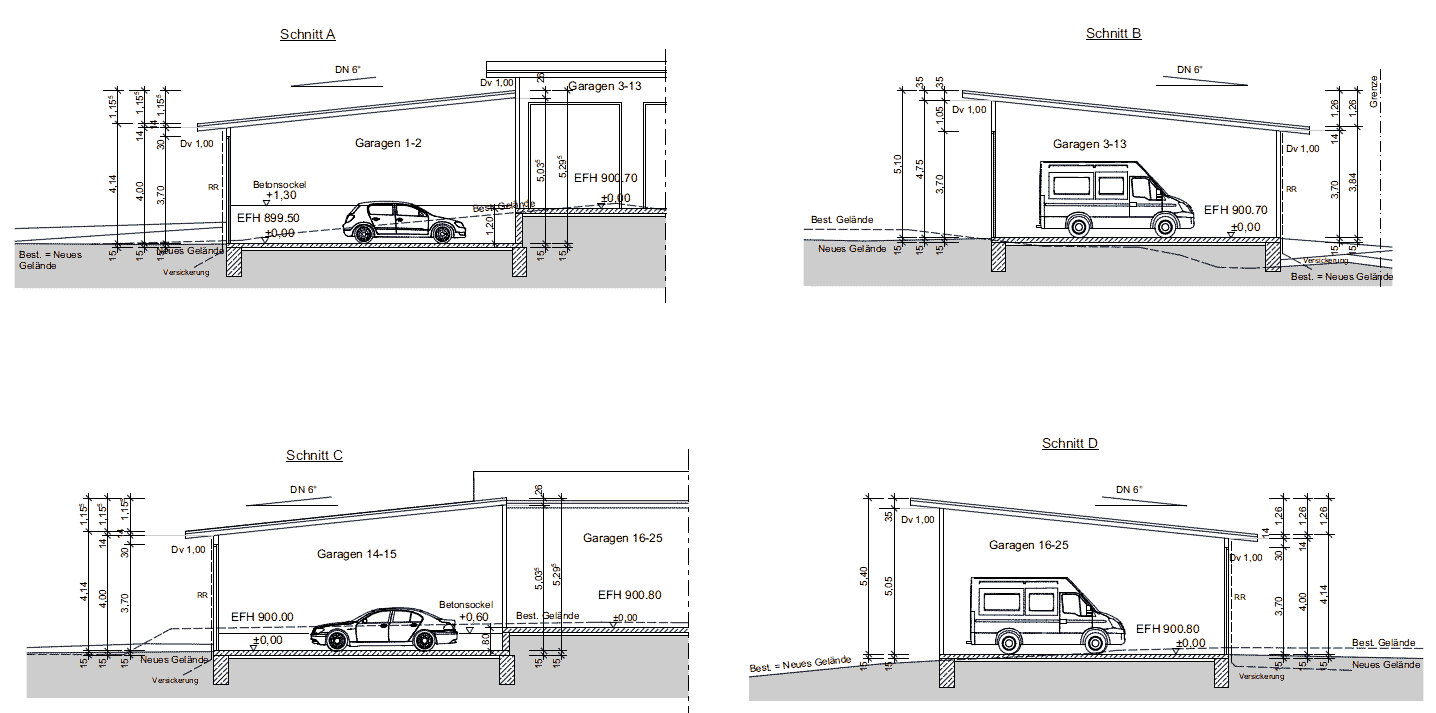 Alle Garagen sind zehn Meter lang, vier Meter breit und 3,70 Meter hoch. Sie besitzen neben einem elektrischen Sektionaltor auch einen Stromanschluss und sind sowohl bei Tag als auch bei Nacht zugänglich. Individuelle Lösungen in Bezug auf den Grundriss sind möglich.